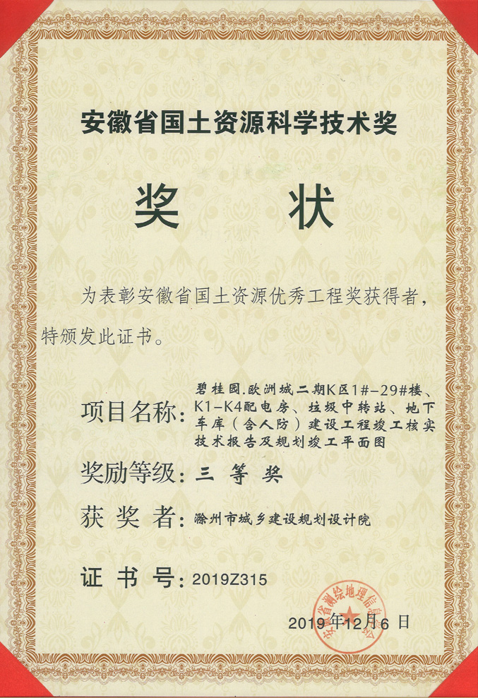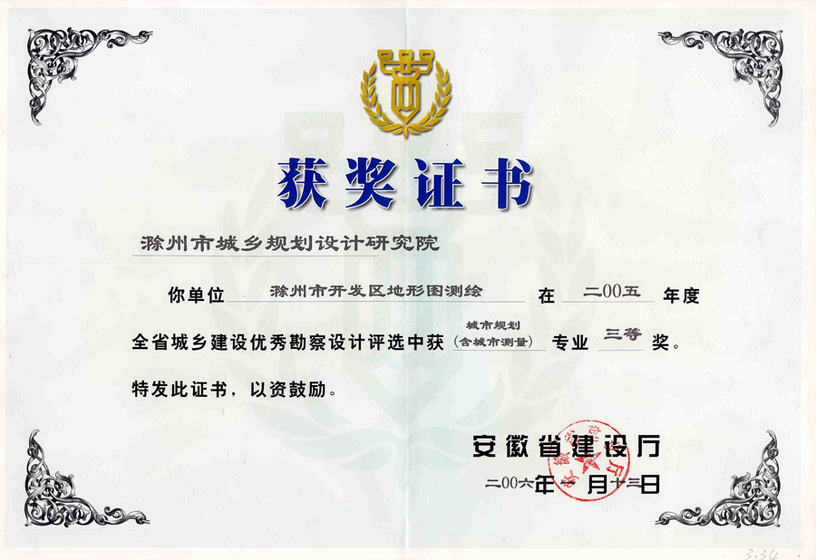 滁州市經(jīng)開(kāi)區(qū)地形圖測(cè)繪規(guī)劃獲獎(jiǎng)證書
